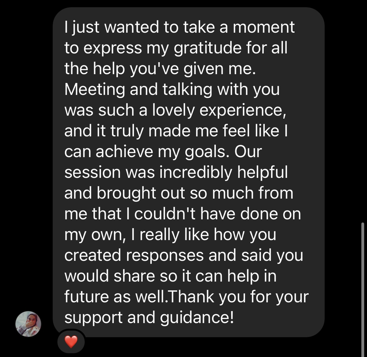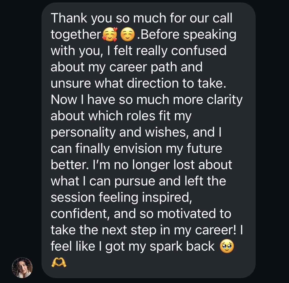 "Thank you for the incredibly valuable sessions, it was worth every penny!! Your tailored advice helped me finally apply this advice to my specific situation. I've seen great results in my networking!”