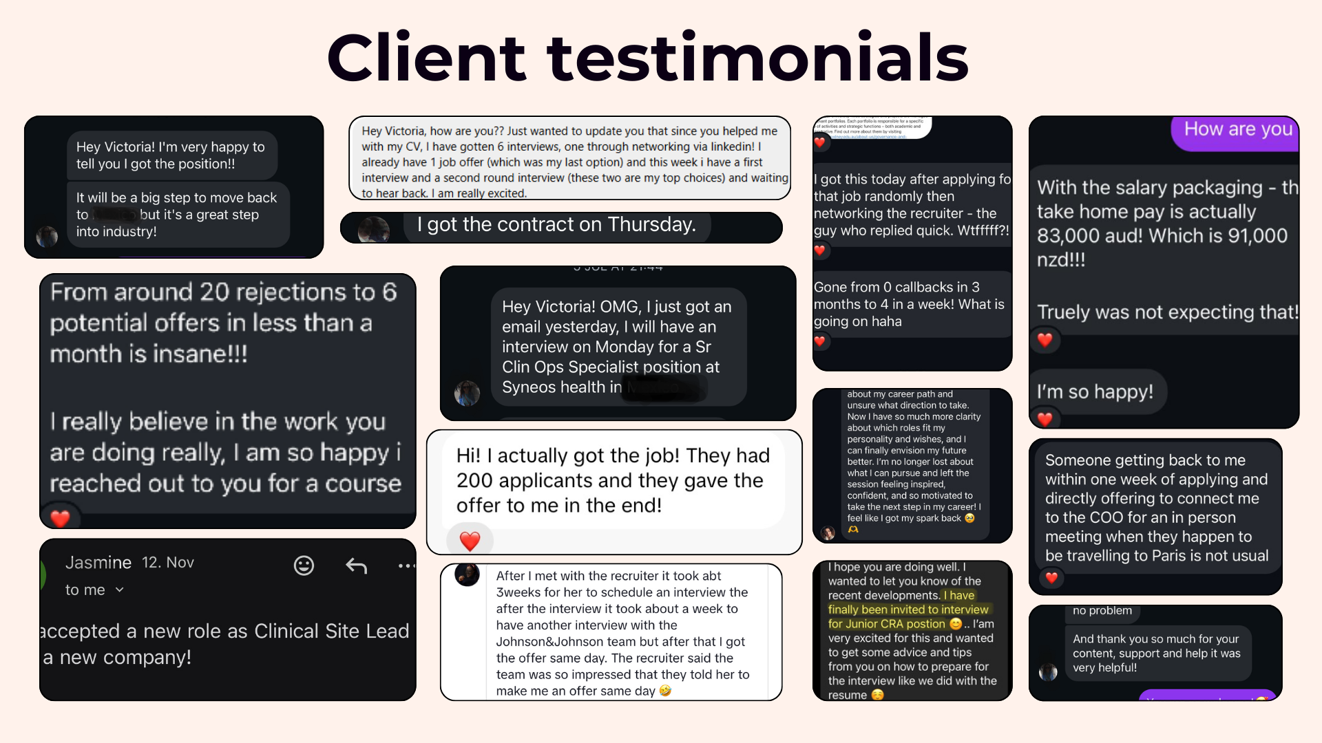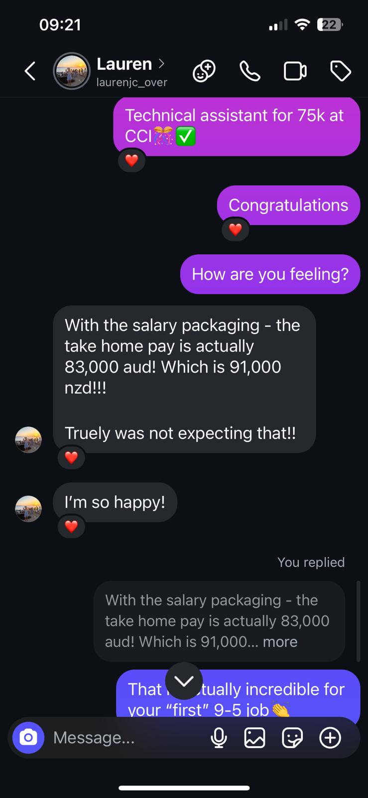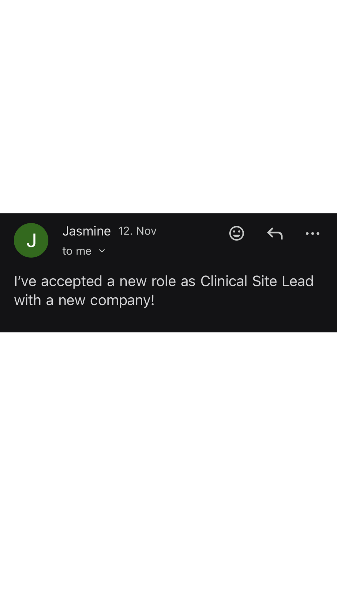 Jasmine came to me to optimize her CV. 2 calls later and I get this email popping up: landing a Clinical Site Lead role! Win!